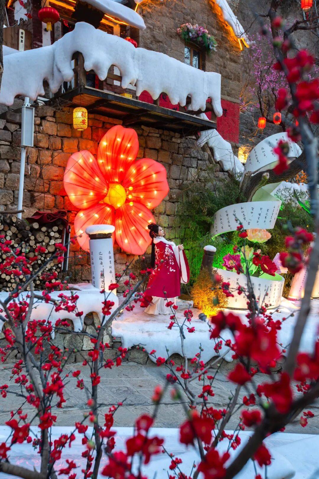 这个冬天,红叶柿岩已寂然换装。雪覆红墙,疏影横斜,邀你共赴踏雪·寻梅记。初探古村,红梅数点,一隅清静点染成趣。寻幽深切,雾凇沆砀,红白掩映如诗如画。盛放庭中,琼枝堆云,恣肆晕染满园风华,中式美学气氛感拉满,只等你来打卡定格。